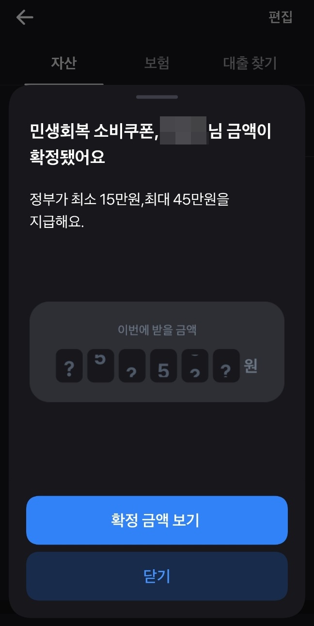 제 이름이 뜨면서 정부가 최소 15만 원, 최대 45만 원을 지급한다는 내용과 확정 금액 보기 클릭란이 뜹니다.