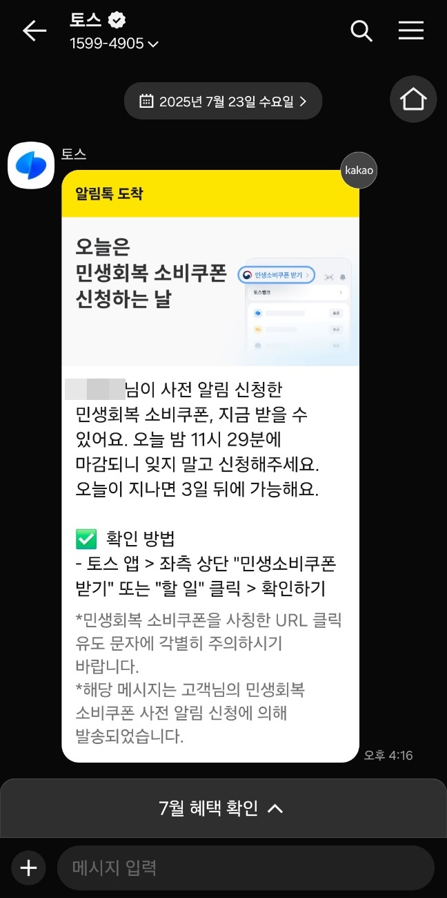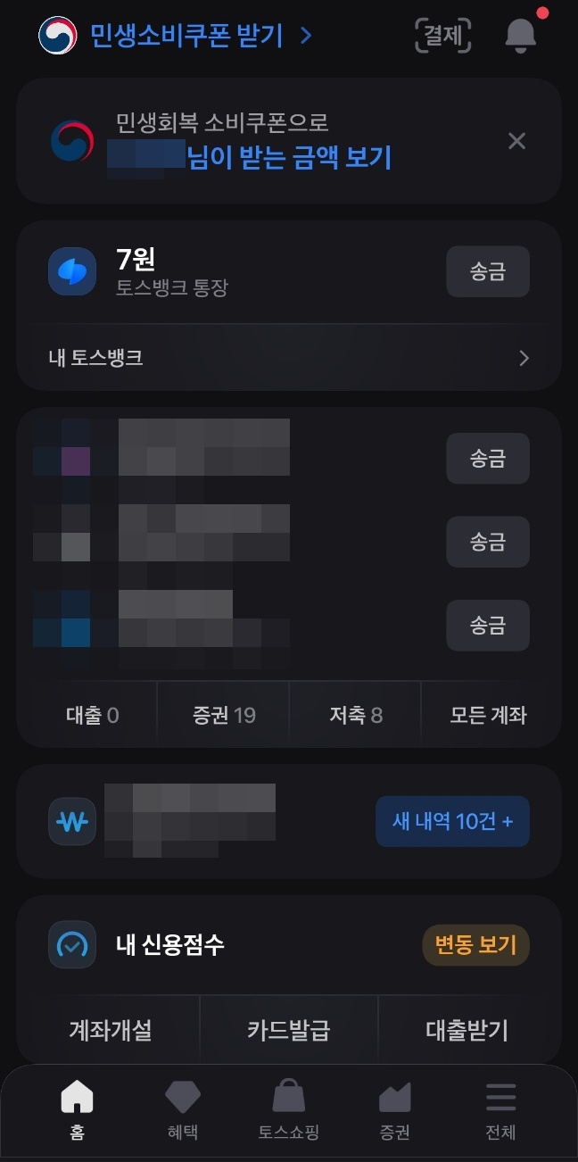 민생회복 소비쿠폰은 온라인과 오프라인 두 가지 방식으로 편리하게 신청할 수 있습니다. 저는 오늘 새벽에 KB국민은행으로 신청했지만 TOSS에서 카톡이 왔길래 다시 한번 신청을 해보았습니다. 토스앱을 들어가면 홈 화면에 민생소비쿠폰 받기를 들어갑니다.