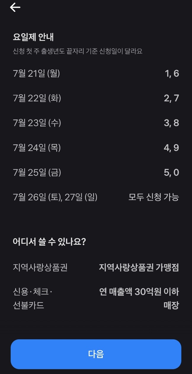 - 주소지 관할 지방자치단체 지역사랑상품권 앱 또는 홈페이지 : 동백전 등 각 지자체별 지역사랑상품권 앱에 접속하여 신청합니다. (신청 다음 날 지급 예정)