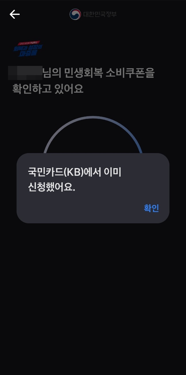 저는 말씀드렸듯이 KB에서 신청을 했기에 중복신청이 안 되게끔 이런 안내문자가 나타나네요.