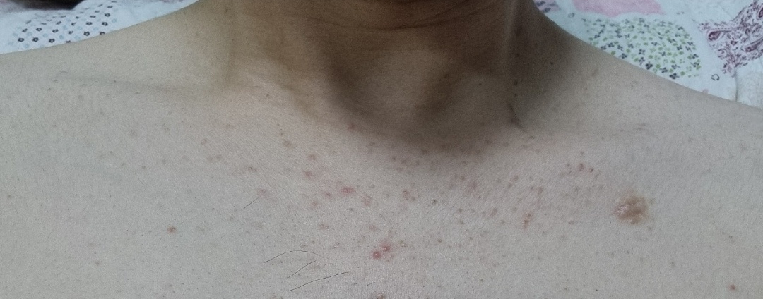 가슴부위는 이마와 다르게 모낭염이 섞여 붉고 약간 올라온 형태로 보일수도 있으며 분포도 넓을 수 있습니다. 이 부위는 스테로이드 유발여드름과 면역억제제에 따른 감영성 모낭염이 혼합된 경우라고 보일 수 있겠는데요. 소론도정(스테로이드)가 피지선을 자극해 여드름을 유발하는 것과 달리 면역억제제는 피부 방어력을 약화시켜 모낭염과 세균성 여드름을 발생시키는 요인입니다.