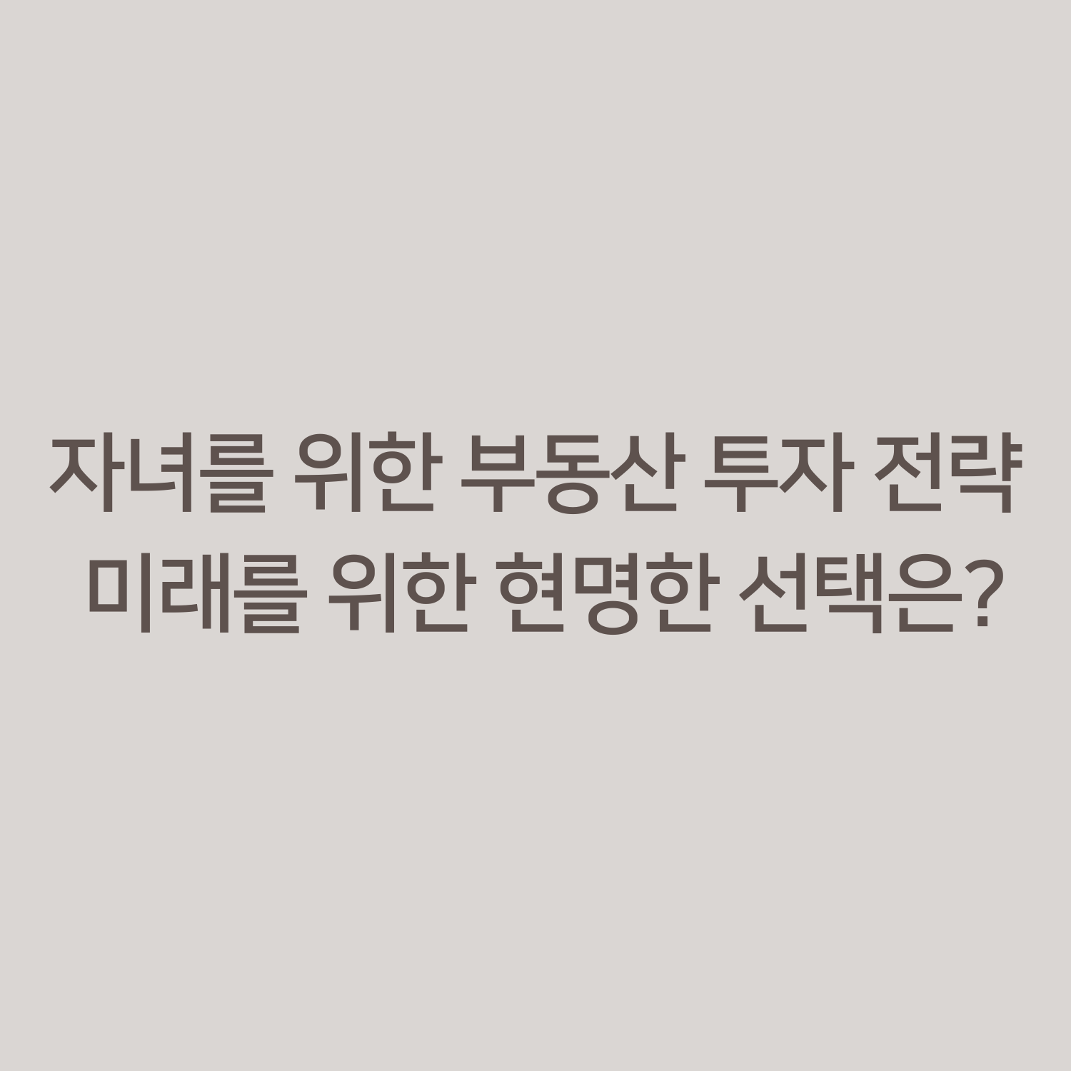 자녀를 위한 부동산 투자는 미래를 대비하는 현명한 선택이 될 수 있습니다. 주거용 부동산, 상업용 부동산, 리츠, 개발 투자 등 다양한 방법을 통해 자녀에게 안정적인 재정적 기반을 마련해 줄 수 있습니다.